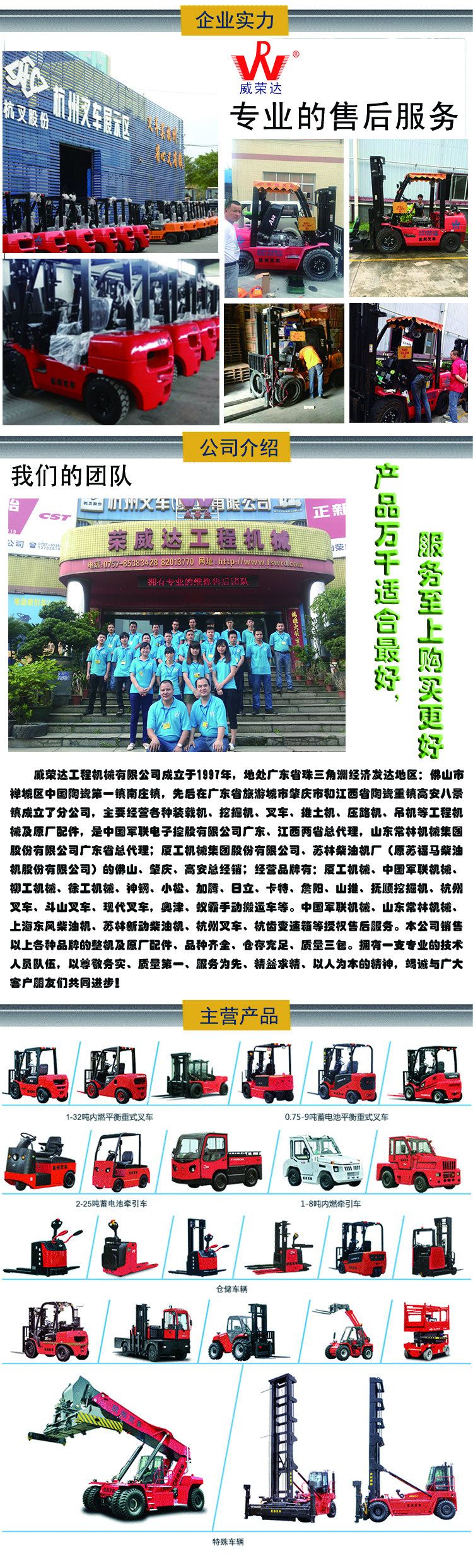 威荣达工程机械主要经营各种装载机、挖掘机、叉车、推土机、压路机、吊机等工程机械整机及原厂配件销售,是杭州叉车、厦工铲车代理商,提供叉车、装载机、挖掘机租赁及维修服务。